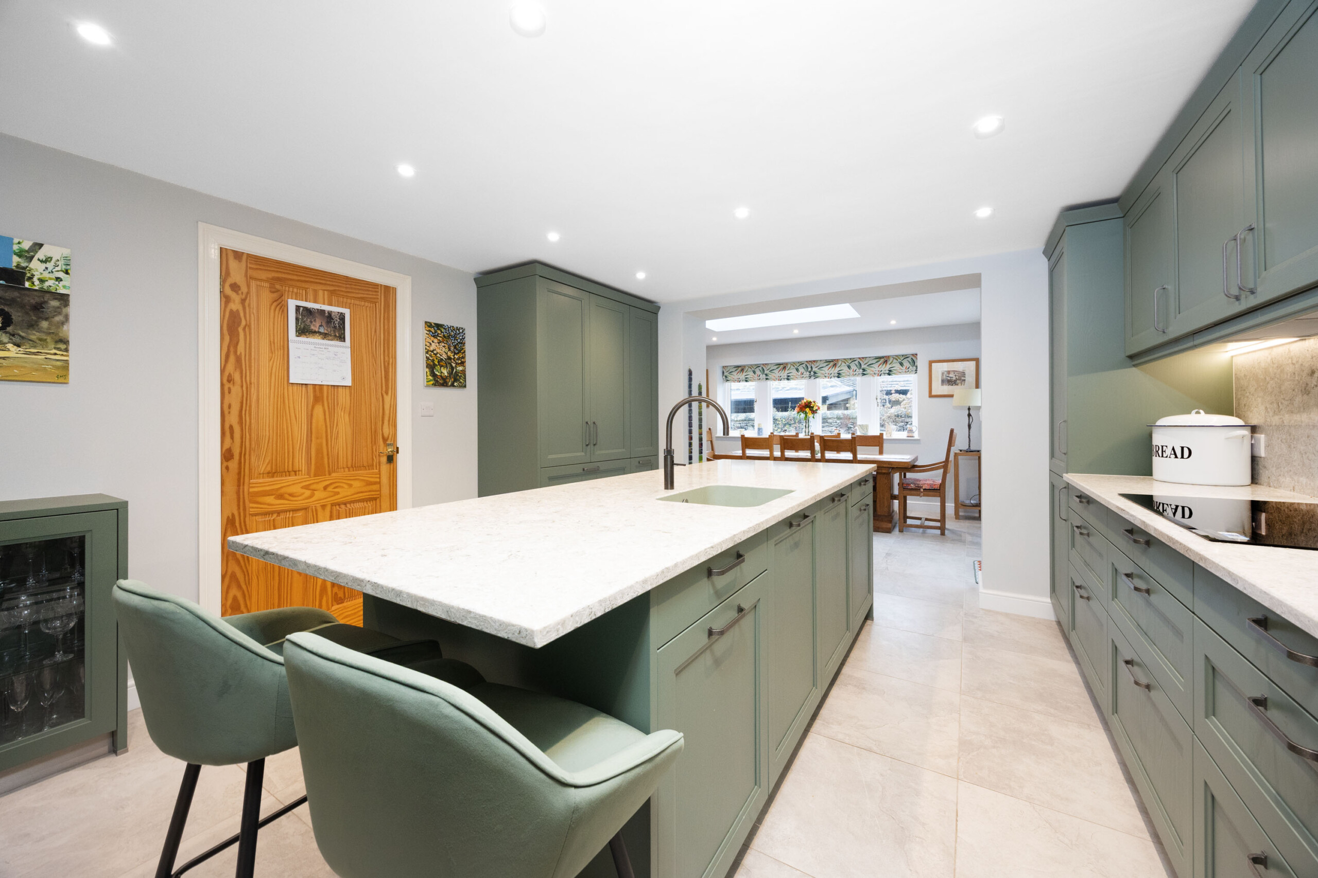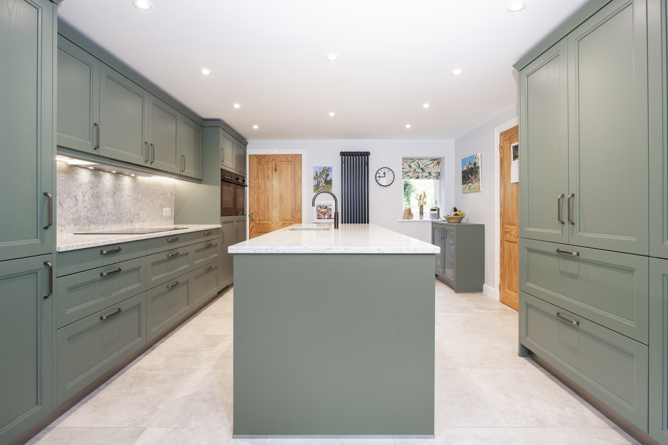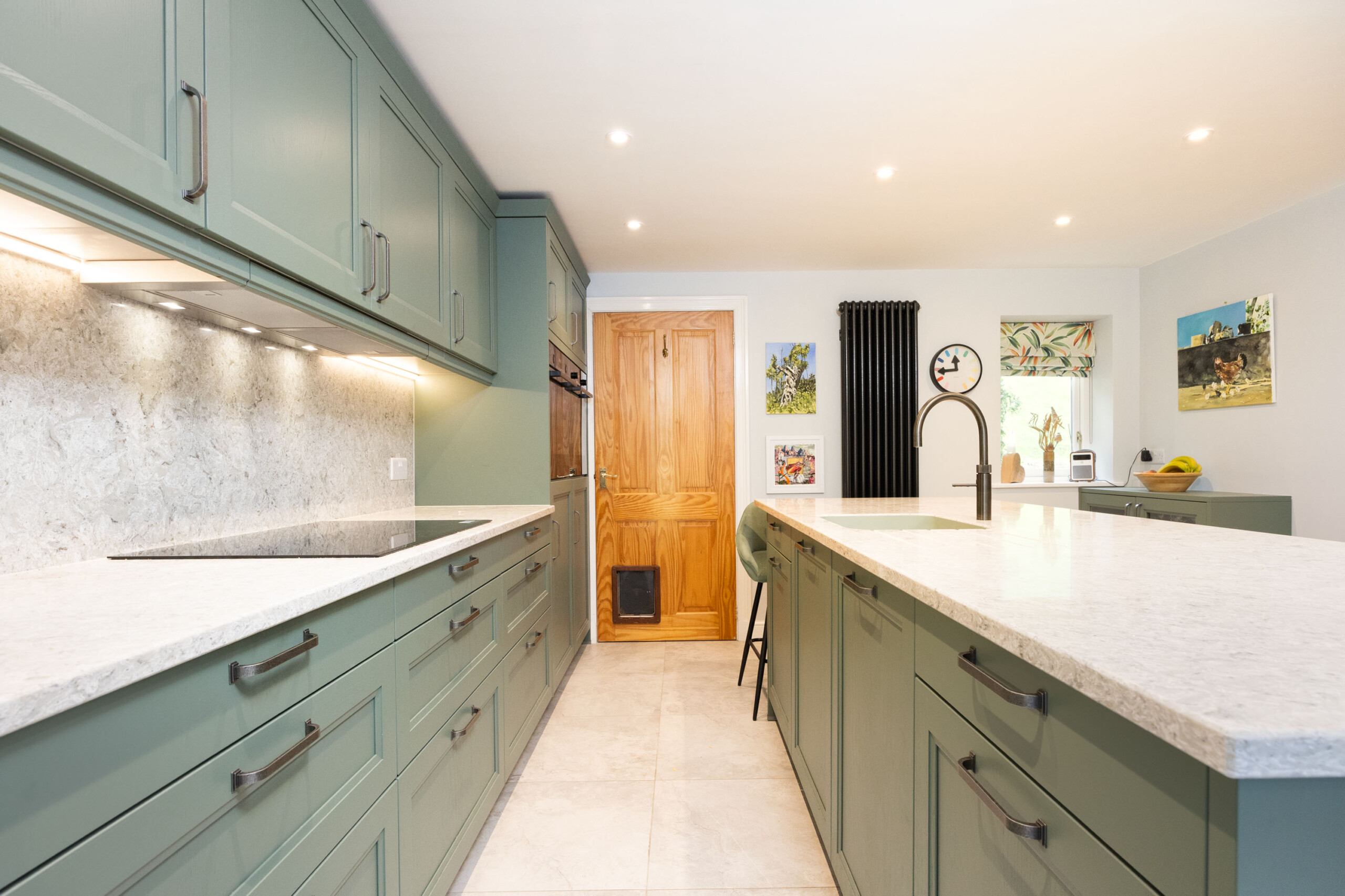 One colour says it all — Eucalyptus Green. This beautiful shade brings a calm, contemporary elegance to the space, creating a kitchen that feels both fresh and timeless. The rich tone adds warmth and depth, making it the perfect statement in modern design.