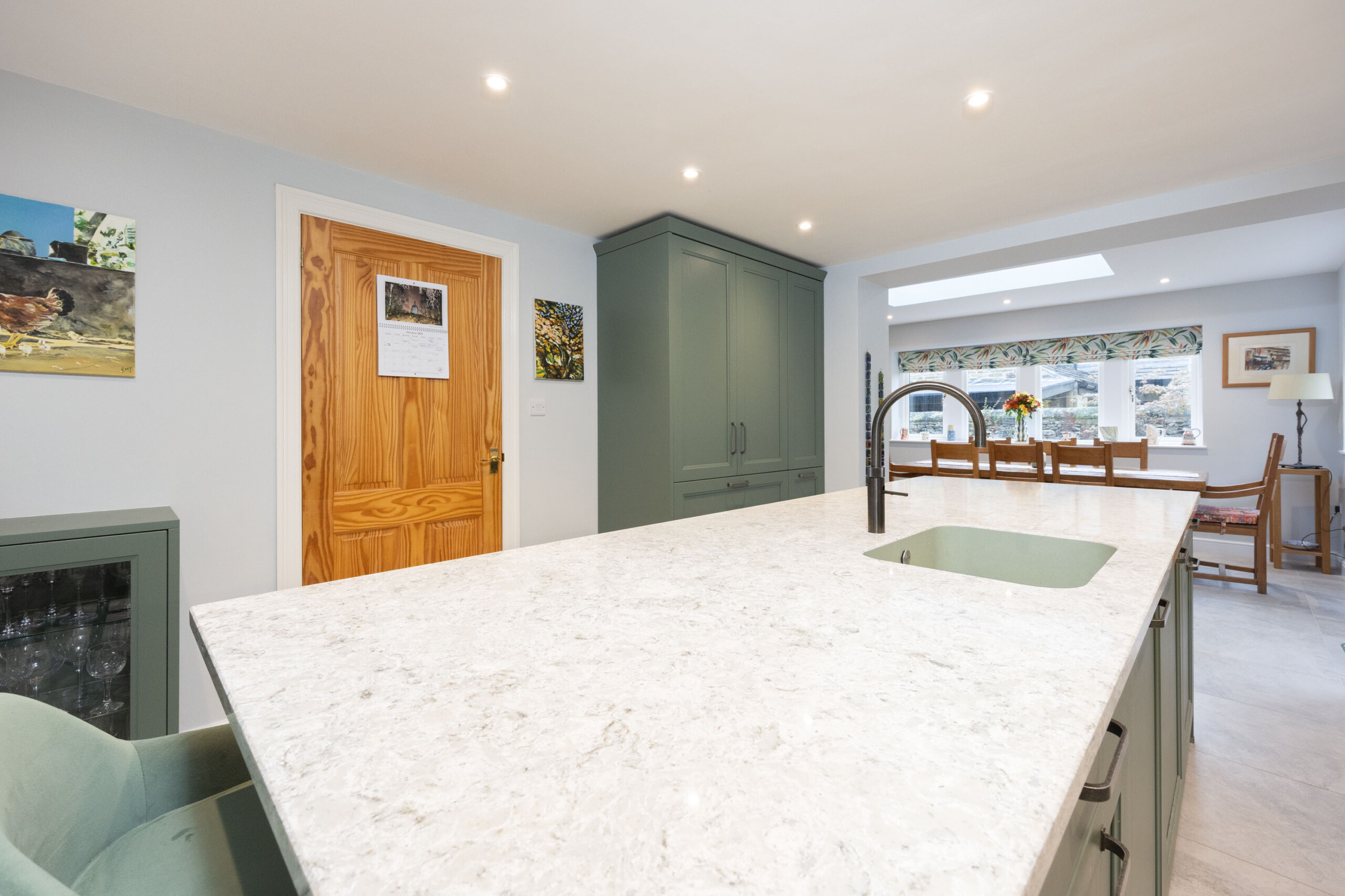 Paired with the luxurious 30mm quartz worktops, the combination delivers a perfect balance of colour and texture — sleek, refined, and effortlessly sophisticated. This kitchen is proof that simplicity, when done well, can be truly striking.